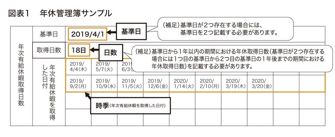 使用者は、労働者ごとに①取得時季、②取得日数および③基準日の3点を記録した年休管理簿を作成し、3年間保存しなければなりません(図表1)。なお、年休管理簿を労働者名簿や賃金台帳と合わせて調製してもよく、また、必要な時にいつでも出力できる状況にあれば、システム上で管理してもよいとされています。
