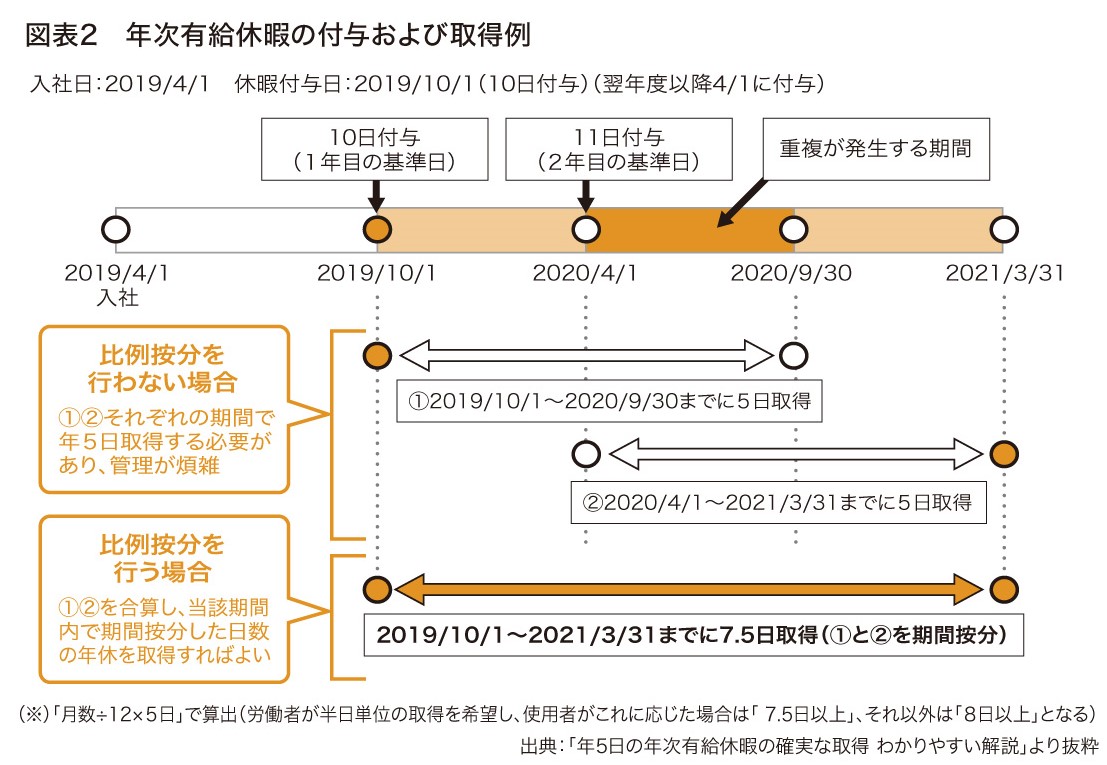 全社的に基準日を合わせるため、入社2年目以降の社員への付与日を統一するなど、入社年と翌年以降とで年休付与日が異なる場合(取得期間が重複する場合)がありますが、その場合も原則として、それぞれの基準日から1年以内に5日の年次有給休暇を取得させる必要があります。ただし、管理を簡便にするため、図表2のように2019/10/1(1年目の基準日)から2021/3/31(2年目の基準日から1年後)までの期間(18カ月間)に、7.5日(18カ月÷12カ月×5日)以上の年休を取得させること(比例按分)が認められています。