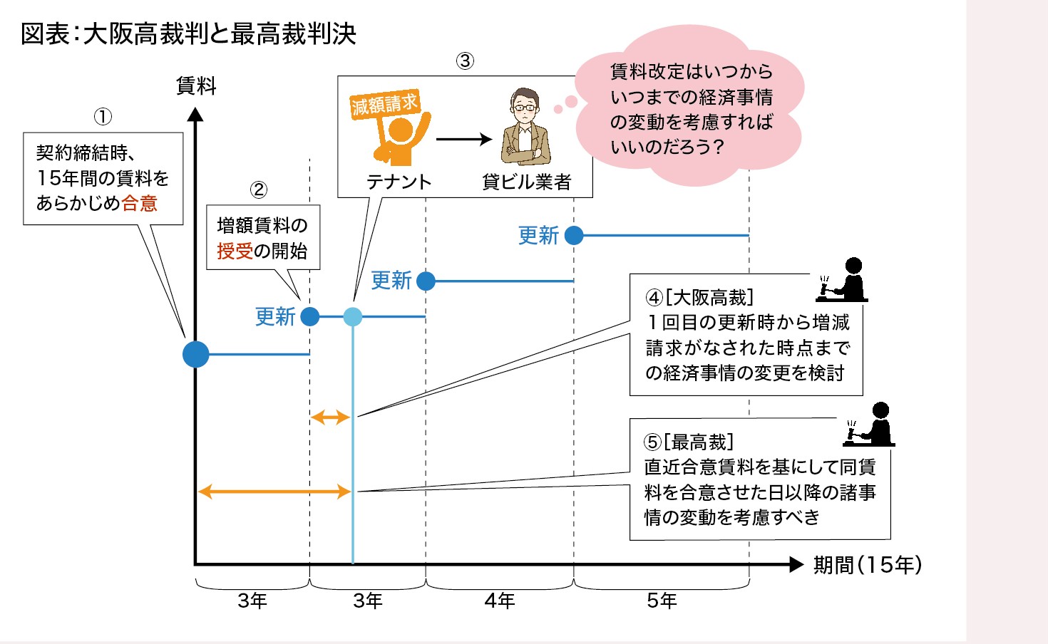事案は賃貸借期間を15年間とする建物賃貸借で、15年を、当初の3年間は○円、次の3年間は○円、次の4年間は○円、最後の5年間は○円というように、15年間の賃料についてあらかじめ合意し、テナントはこの合意に従って、上記の各期間ごとにあらかじめ合意された増額賃料を支払っていたところ、一度目の更新期間経過後にテナントが合意していた賃料の減額を請求したというものです。大阪高裁は「事情の変更とは、増減を求められた額の賃料の授受が開始された時から請求の時までに発生したものに限定すべきことは、事の性質上当然である」として、1回目の更新時から増減請求がなされた時点までの経済事情の変更を検討し、賃料が不相当になったとはいえないと判断しました。