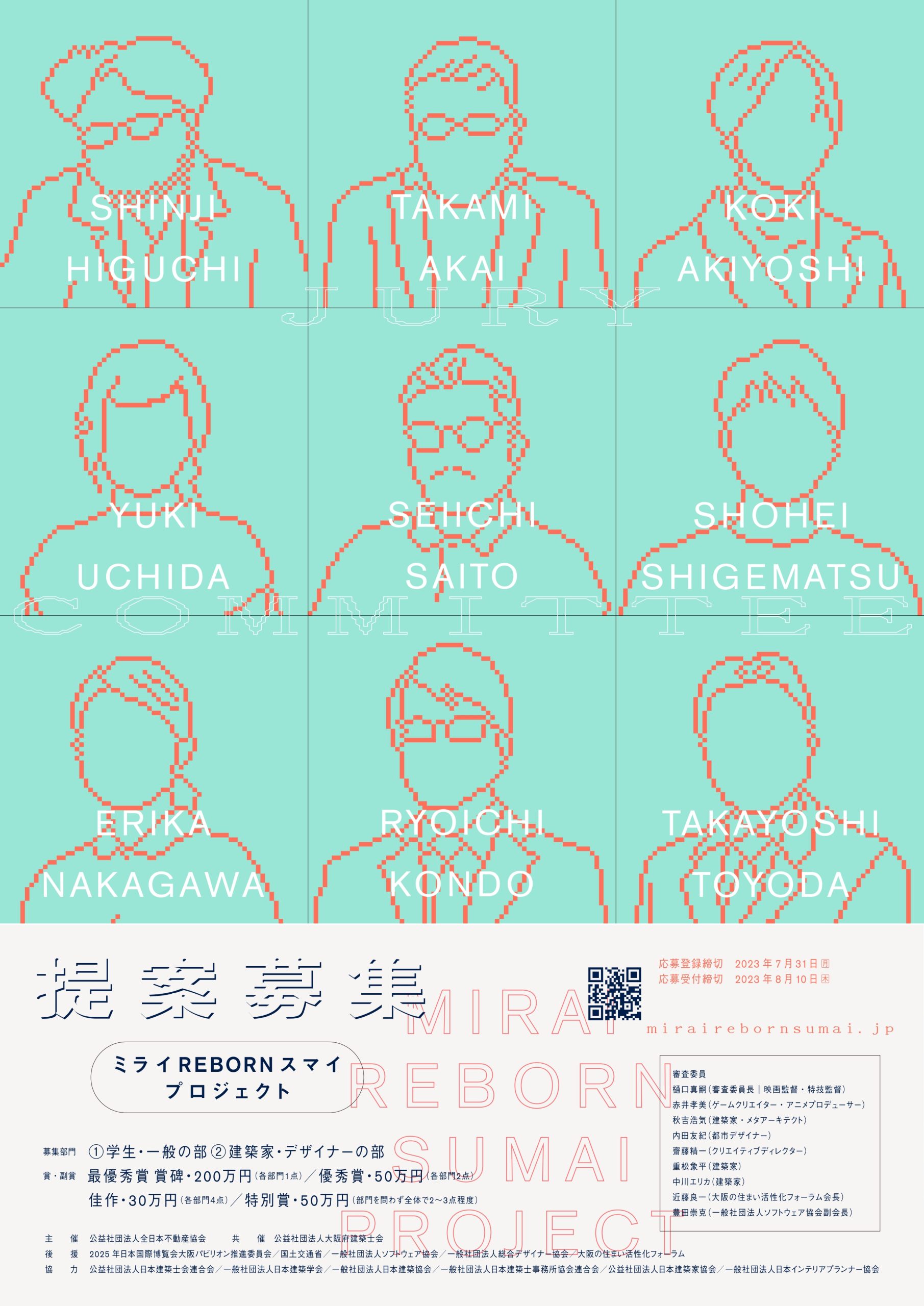 大阪ヘルスケアパビリオンへの出展参加に向けて実施中の建築デザインコンペ「ミライREBORNスマイ プロジェクト」は、8月23日(水)に1次審査を行い、厳正なる審査の結果、14点(建築家・デザイナーの部7点、学生・一般の部7点)の1次通過が決定しました。