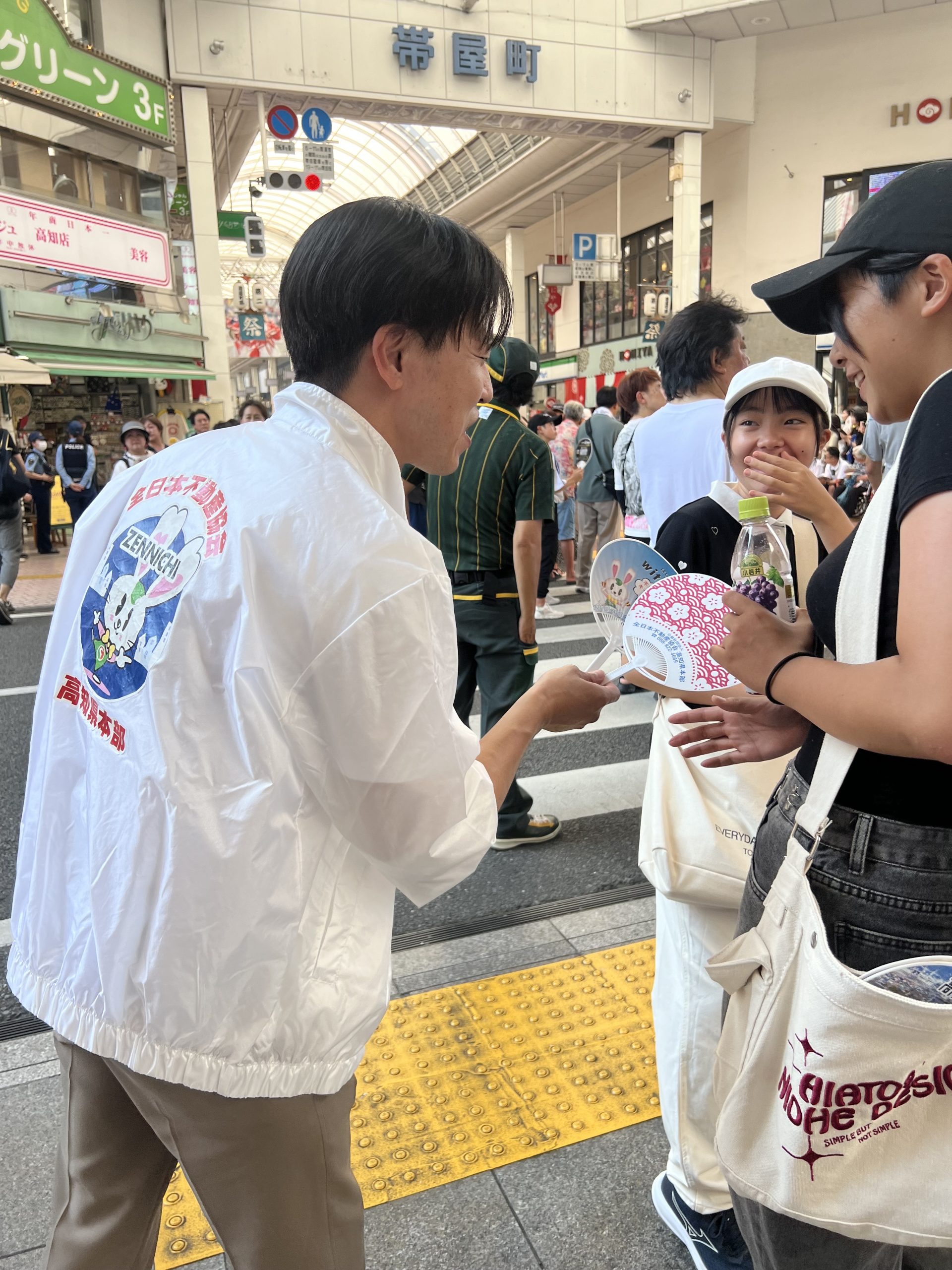 青年部会は、「第72回高知よさこい祭り」にて、恒例行事となりつつある全日高知県本部PR活動の一環として、うちわ配りを実施しました。青年部が揃いの全日ジャンパーを着用し、高知県本部を出発。帯屋町演舞場を中心に、西方面組と東方面組に分かれて「全日高知」のPRを行いながら、来場者に笑顔でうちわを配布しました。