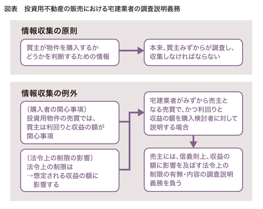 に係る一定の法令に基づく制限につき、当該契約の相手方に対して説明することを求められていること(宅建業法35条1項2号参照)等を考慮すれば、みずから投資用不動産を販売しようとする宅地建物取引業者は、その販売に当たり、提示した販売価格の妥当性を説明する前提として、当該不動産において想定される利回りおよびその基礎となる収益の額を、当該不動産の購入を検討する者に対して説明する場合には、信義則上、想定される利回りの基礎となる収益の額に影響を及し得る法令上の制限の有無およびその内容についても、調査して説明すべき義務を負うものと解するのが相当である。