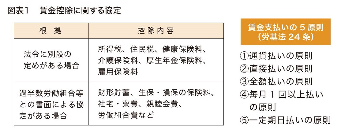 労働基準法(以下「労基法」)24条では、「賃金は、通貨で、直接労働者に、その全額を支払わなければならない」と定めていることから、原則として、使用者は賃金の全額を労働者に支払わなければなりません(賃金全額払いの原則)。ただし、「法令に別段の定めがある場合、または過半数労働組合等との書面による協定(賃金控除に関する協定)がある場合においては、賃金の一部を控除して支払うことができる」としており、賃金からの控除を例外的に認めています(図表1)。