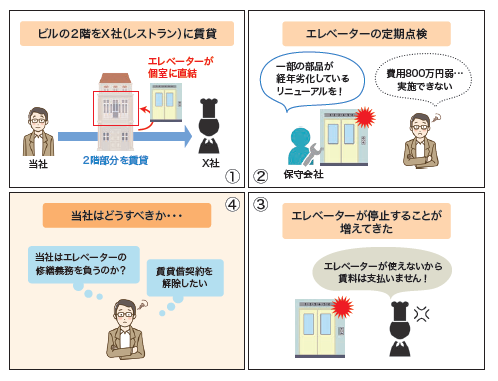 当社は、レストラン営業を営むX社にビルの2階を賃貸し、ビルにはレストランの個室に直結するエレベーターを設置しています。定期点検の際、一部部品の経年劣化のためリニューアルの勧告を受けましたが、数十年前のエレベーターであり、リニューアルには800万円弱の費用がかかるため実施できておりません。このため、エレベーターが停止することが少し増えてきました。