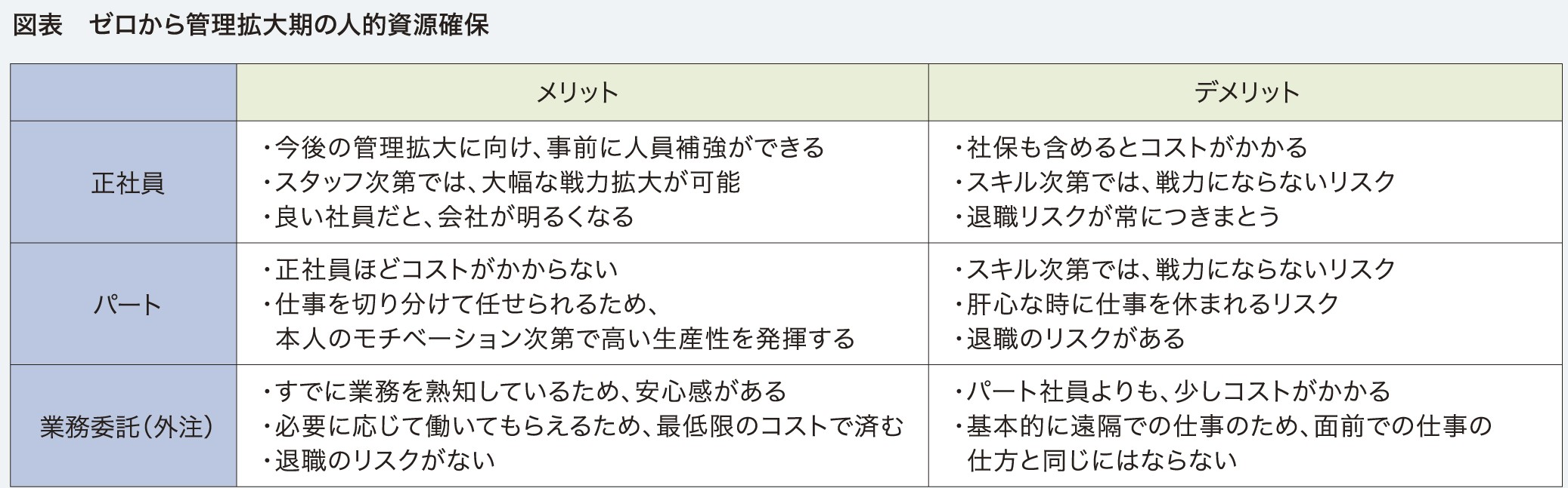 人的資源を検討する上で、まず考えたいのが正社員・パート・外注の使い分けです。それぞれに明確なメリット・デメリットがあり、最適なバランスは、会社の成長段階や業務内容によって異なります。