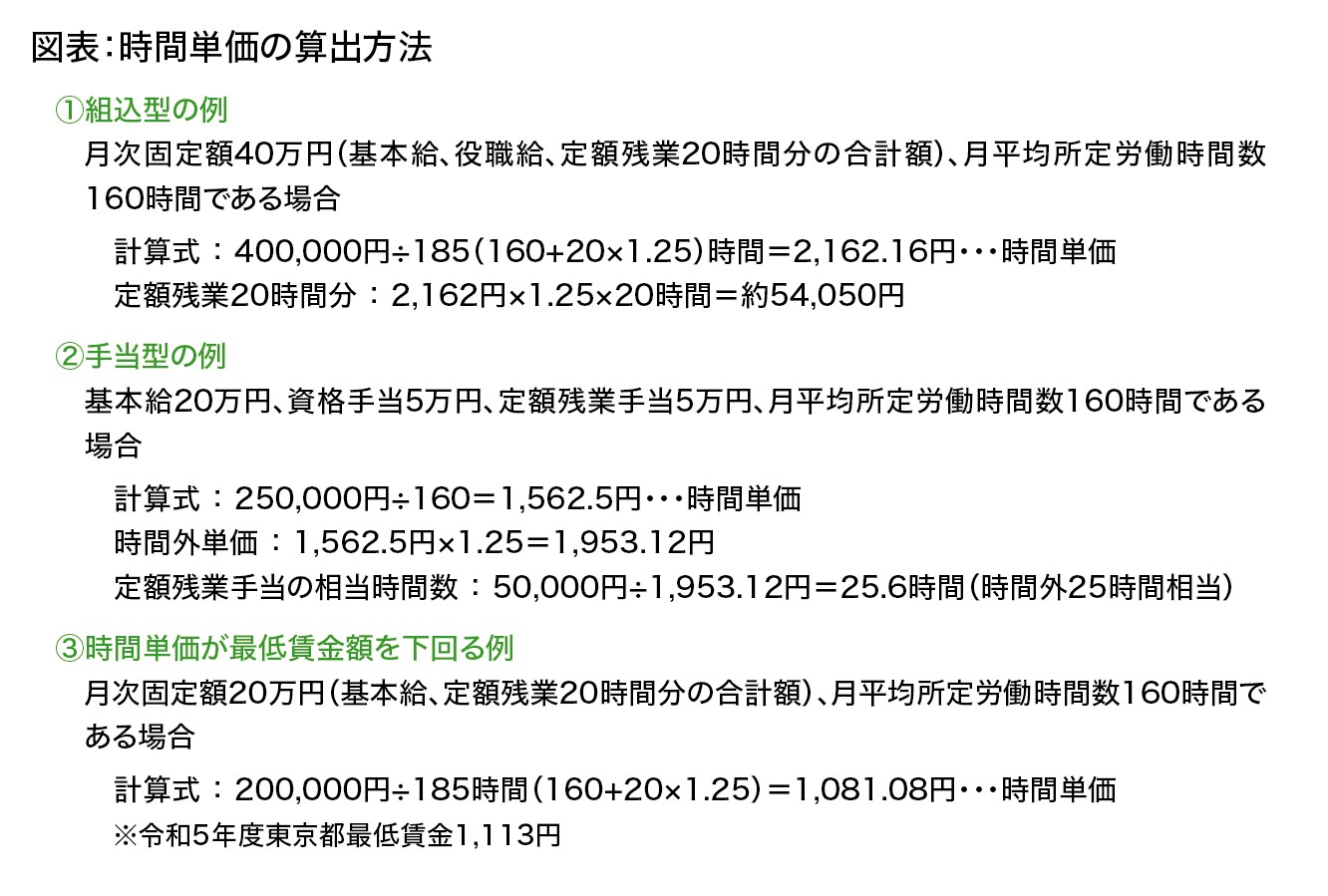最後に、新卒者に対し定額残業制を適用する際の留意点を挙げます。昨今の最低賃金額の上昇により、時間単価が最低賃金額を下回っている企業を見かけることがありますので、毎年ご確認ください(図表)。