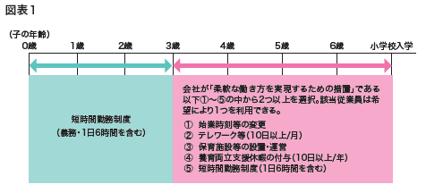 2025年10月施行の改正育児・介護休業法により、育児と仕事を両立するための「柔軟な働き方を実現するための措置」(図表1)の5つの中から2つ以上を選択することが義務付けられました。これにより、短時間勤務制度を選択した会社では、該当従業員から申出があれば、子が小学校に入学するまで時短勤務ができるよう、就業環境を整備することが必要です。 -