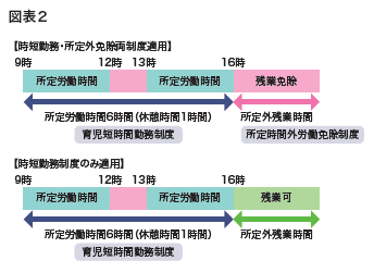 つまり、図表2上段のとおり、「育児短時間勤務制度」により短縮された所定労働時間である6時間以後の残業を命じることはできません。所定時間外労働免除の申出がない場合には残業をしてもらうことも可能です。