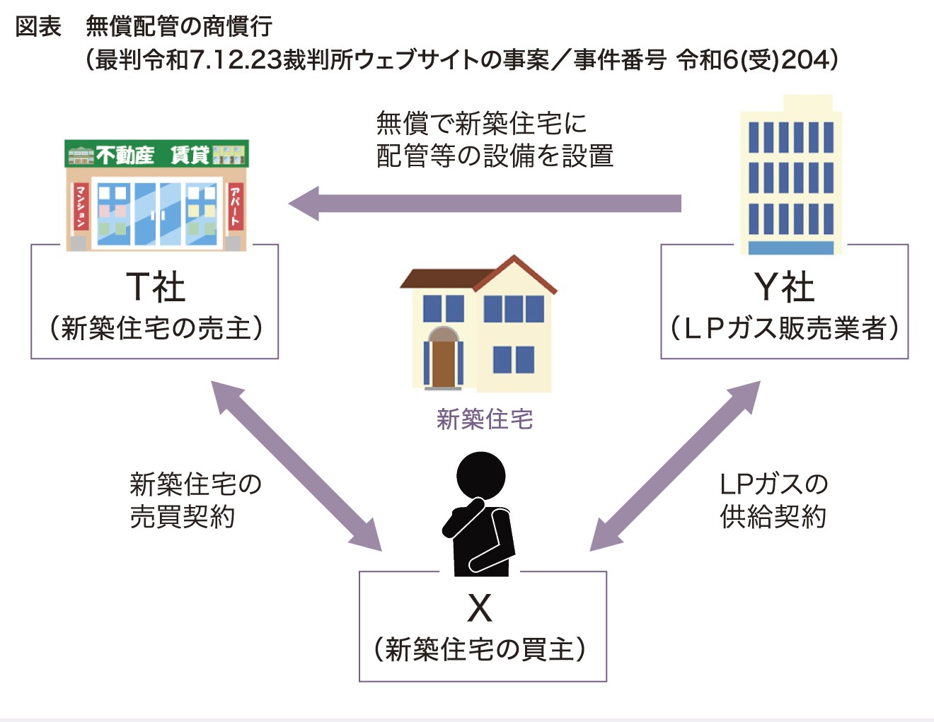 しかるに令和7年12月、最高裁により、供給契約を解約するときに違約金を支払うとする④の条項が、消費者契約法9条1号によって全部無効とされました※。売主T社が、買主Xに、LPガスの配管設備等(本件消費設備等)を付けて住宅(本件住宅)を販売し、Xが、LPガス販売業者であるY社との間で、LPガスの供給契約(本件供給契約)を締結していた事案です。本件供給契約には、『供給契約期間満了前に供給契約を終了させようとする場合には違約金を支払う』との条項(本件条項)が定められていました(図表)。※ 消費者契約法9条1号は、平均的な損害の額を超えるものを無効としているが、最高裁は、本件供給契約と同種の消費者契約の解除に伴い、Y社に生ずべき平均的な損害は存在しないと認定した。